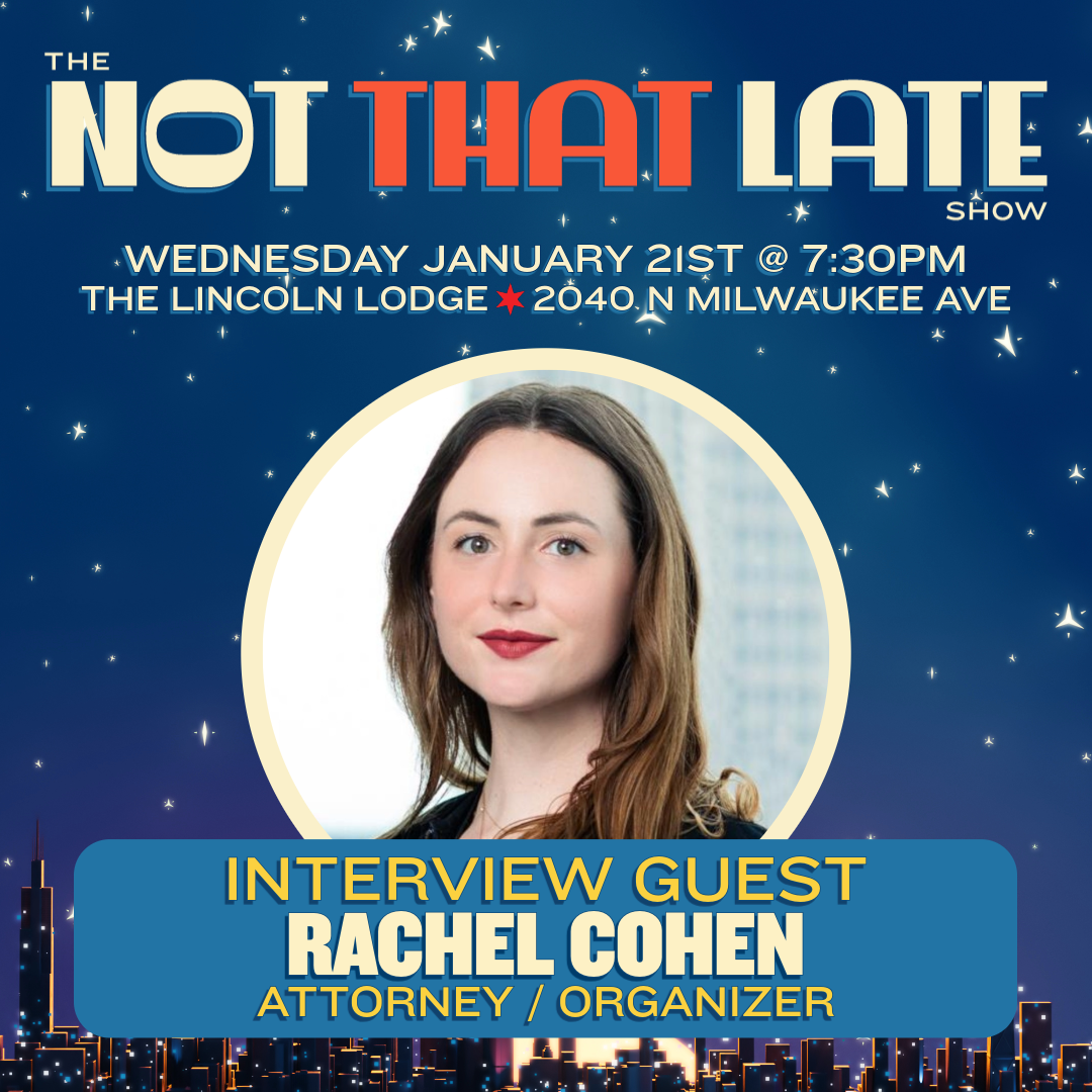 The Not That Late Show is a POC- and queer-led late-night talk show hosted by Justin Swinson, featuring an ensemble of Chicago comedians debuting brand-new material each month. NTLS is just like the late night talk shows you would see on TV (Colbert, The Daily Show, Last Week Tonight, etc.), but with a Chicago focus. Taking place every third Wednesday at The Lincoln Lodge, the show blends sketch comedy, sharp interviews, and live music from emerging local artists. Past guests have included Mayor Brandon Johnson, Writer and Educator Dr. Eve L. Ewing, Stephanie Skora of the Girl I Guess Progressive Voter Guide, and Medea Benjamin of CODEPINK amongst others.