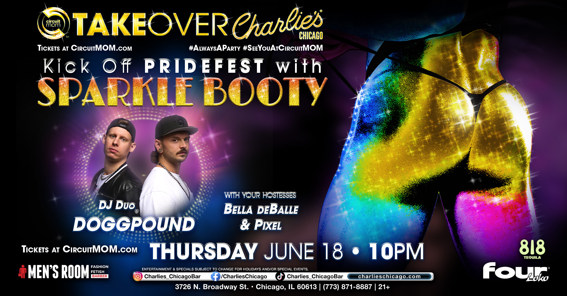 Get your Chicago PrideFest weekend off to an amazing start at SparkleBooty, our Charlie’s Chicago takeover! On Thursday, June 18th starting at 10pm the daring DOGGPOUND duo will keep your 🍑booty🍑 shaking all night while Charlie’s House Queens Pixel and Bella DeBalle entertain you with their ✨sparkling✨ personalities.